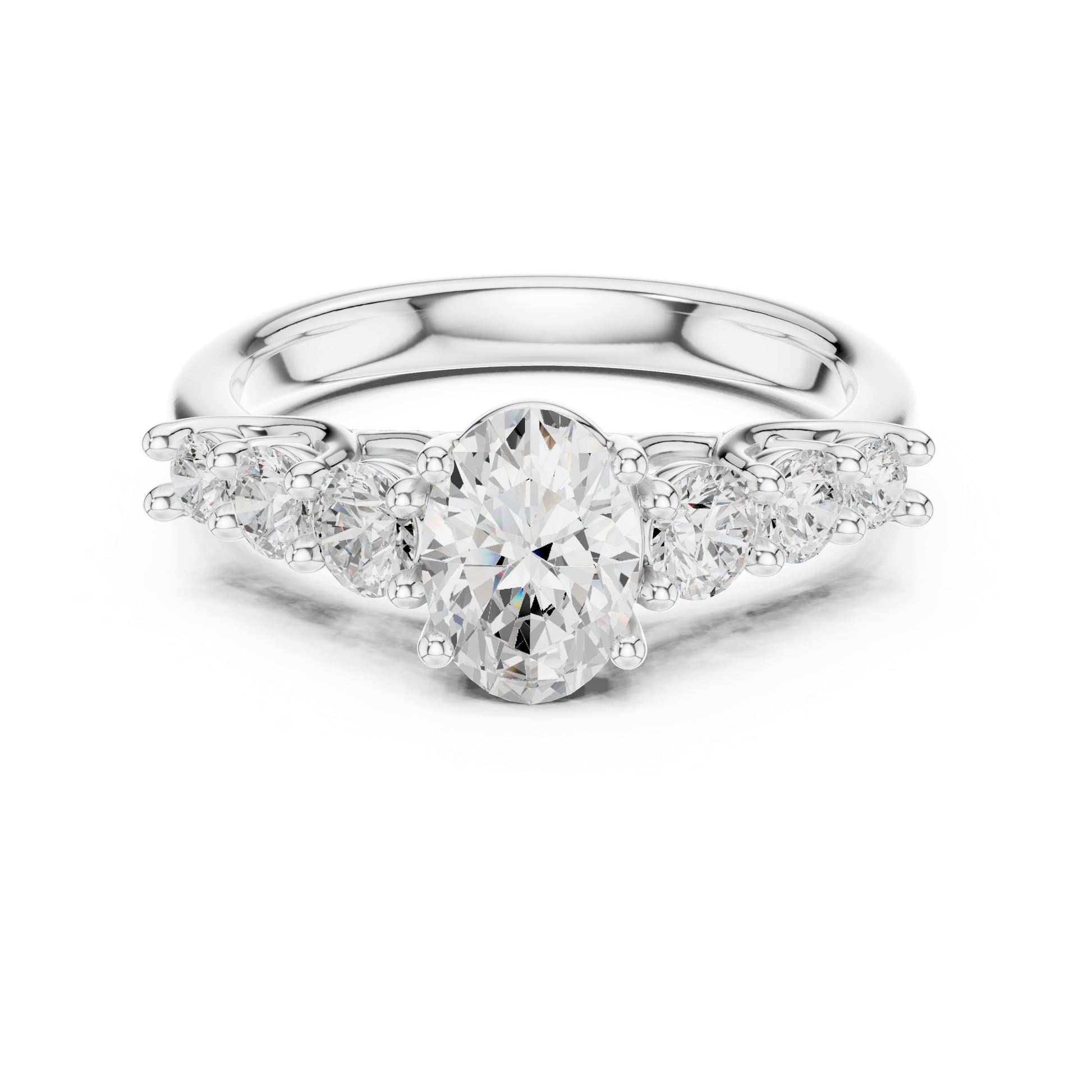 This breathtaking engagement ring features a dazzling oval-cut center diamond, beautifully complemented by a series of round brilliant side stones that gracefully taper along the band. Expertly crafted in 9K/10K/14K/18K/22K white gold, the ring exudes timeless elegance and modern sophistication.