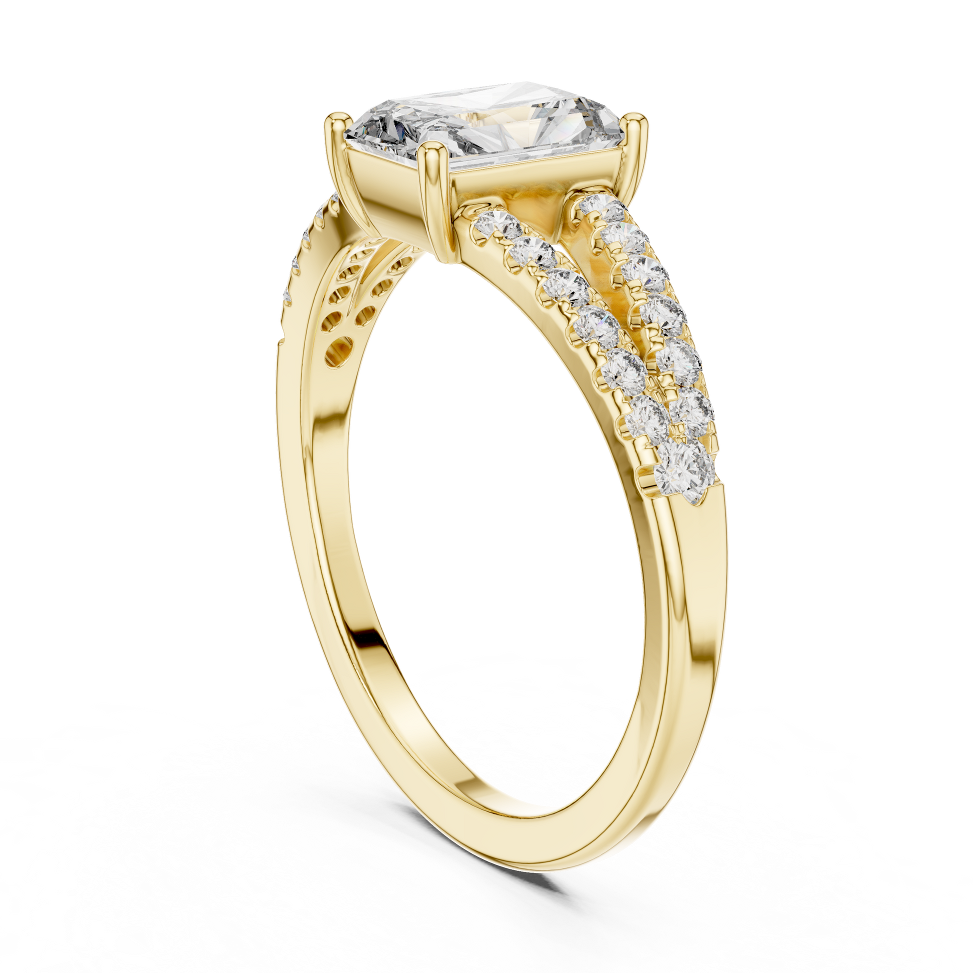 This radiant-cut split shank ring is crafted to shine from every angle. The center stone dazzles with clean, mirror-like flashes, while the split pavé diamond band adds luxurious sparkle and dimension. Designed for women who love timeless glamour with a modern twist.