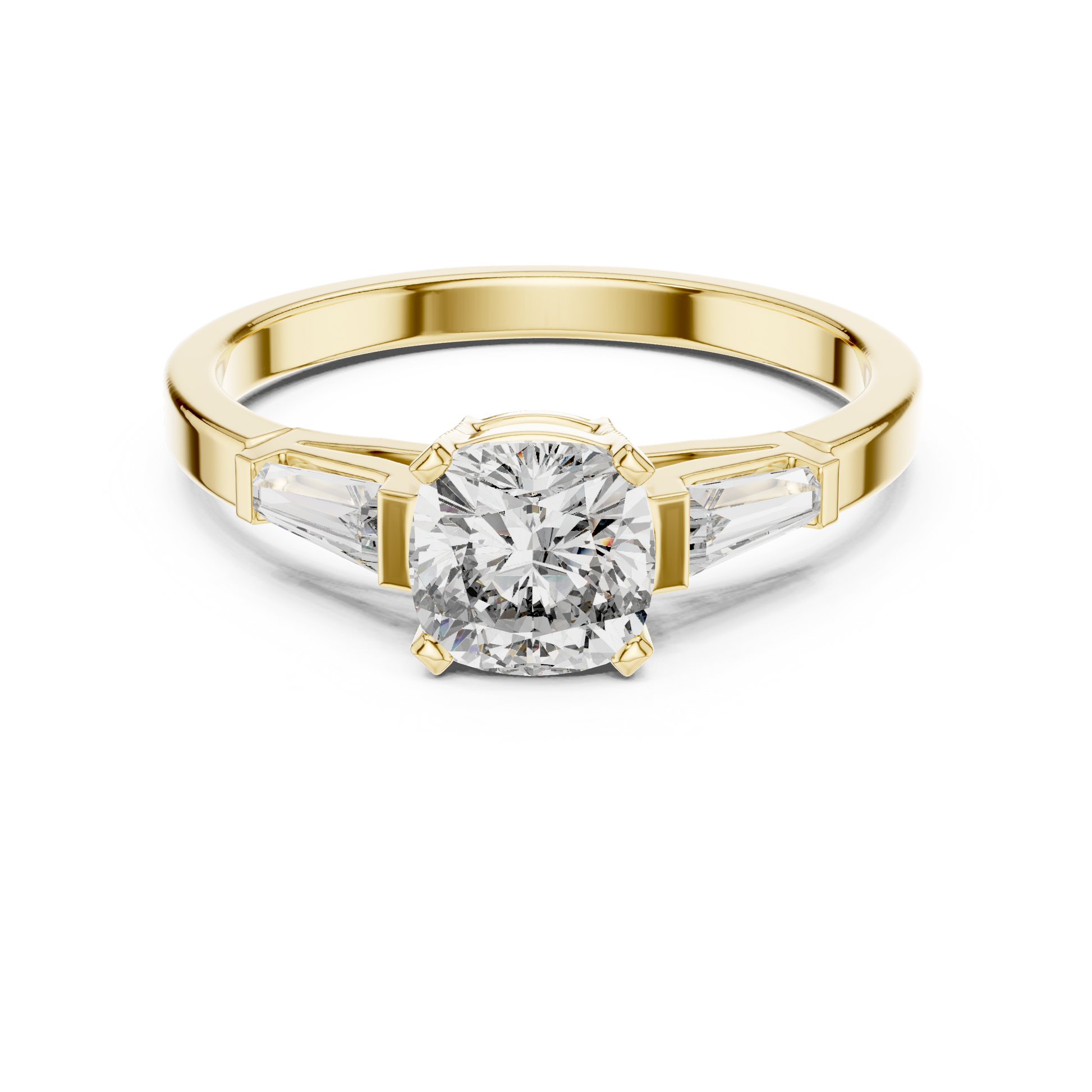 A stunning fusion of brilliance and elegance, this handcrafted cushion-cut engagement ring features two tapered baguette side stones set on a sleek, polished band. Designed for women who love classic beauty with a modern twist, this ring makes every moment unforgettable.