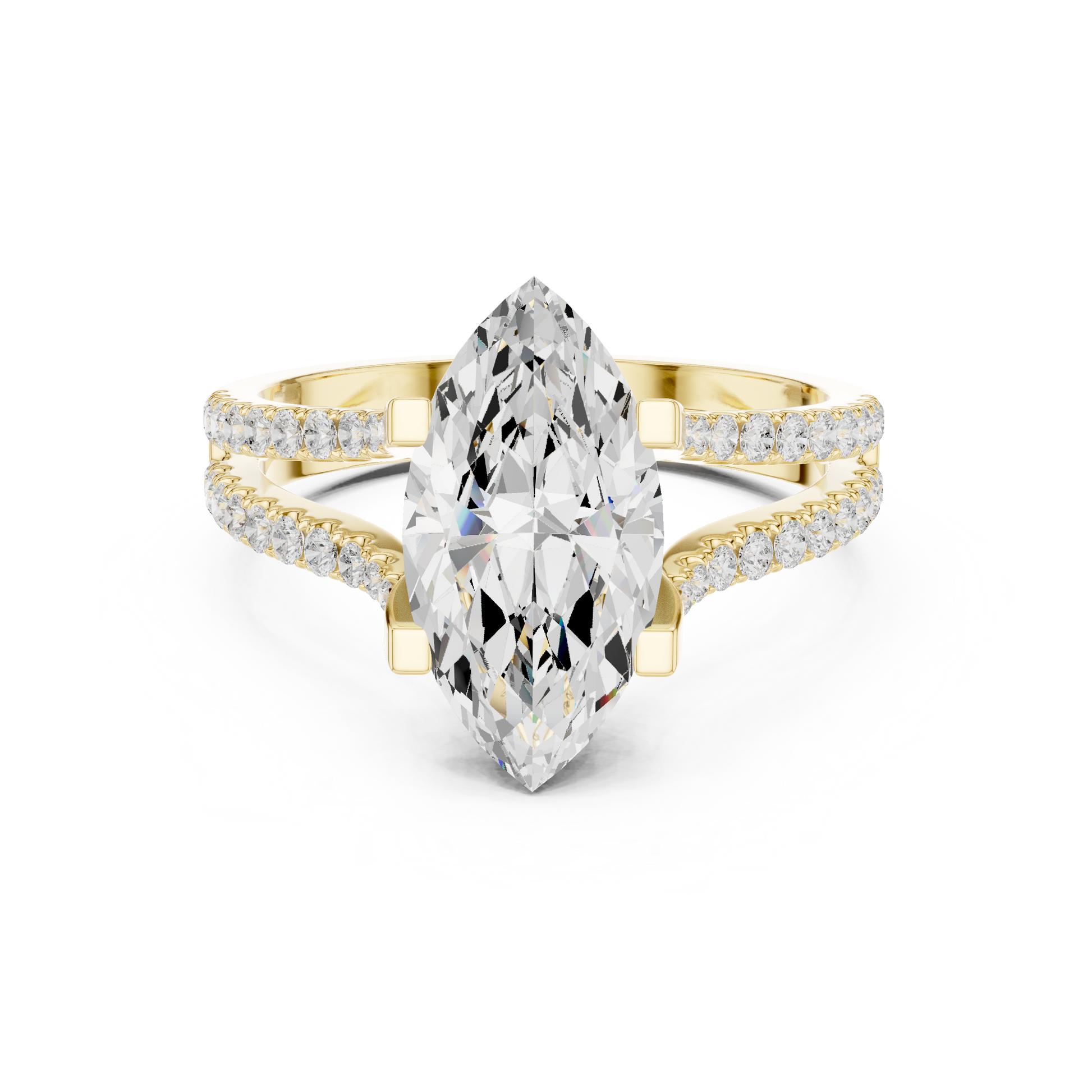 The marquise cut creates a slimming, elongated finger look, while the pavé split band adds a romantic sparkle that stands out instantly.