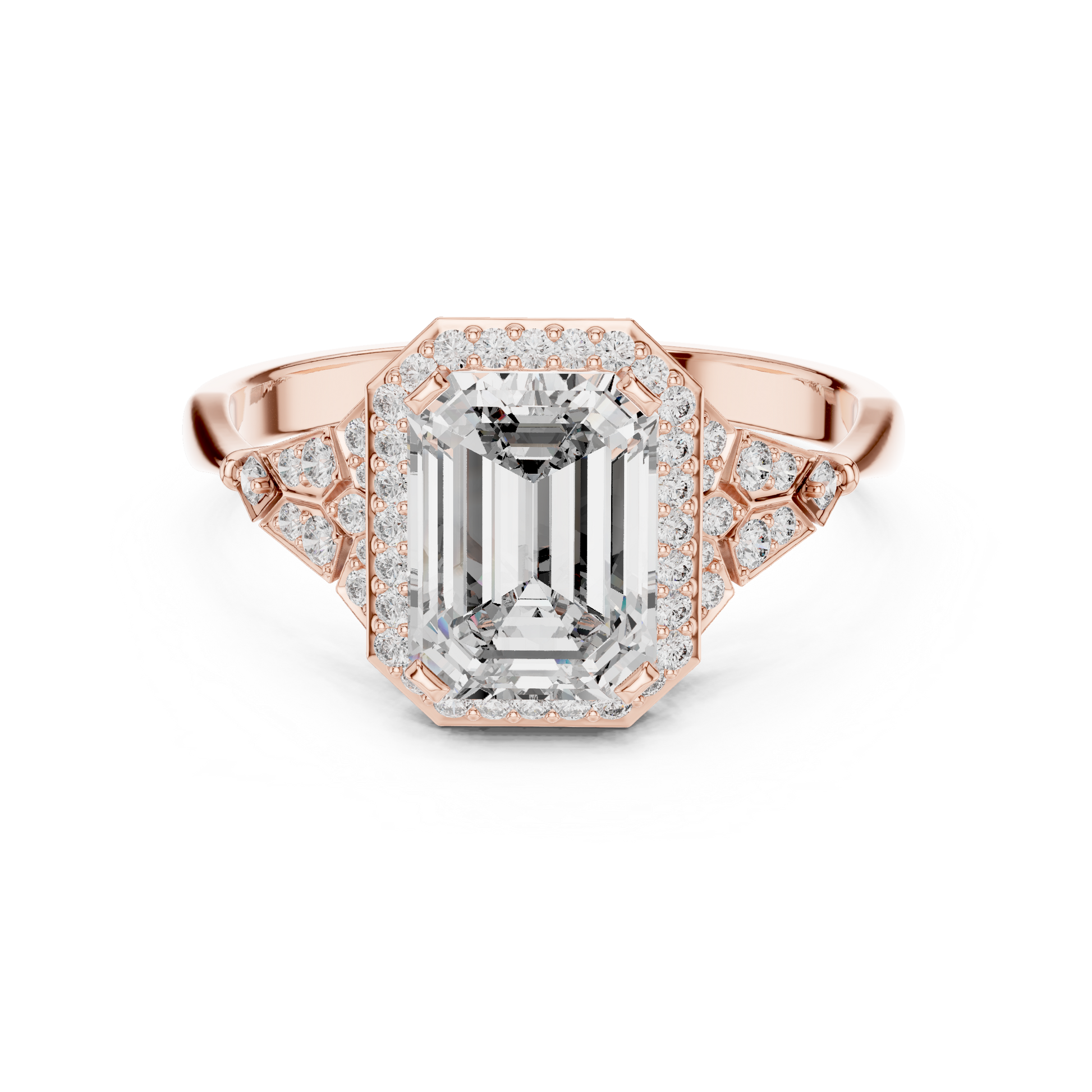 Capturing the glamour of the Roaring Twenties with a modern touch, this Emerald Cut Art Deco Ring is a masterpiece of light and geometry. Featuring a pristine emerald-cut center stone surrounded by a sparkling halo and flanked by unique geometric shield accents, this ring is designed for the woman who appreciates timeless elegance and architectural beauty.