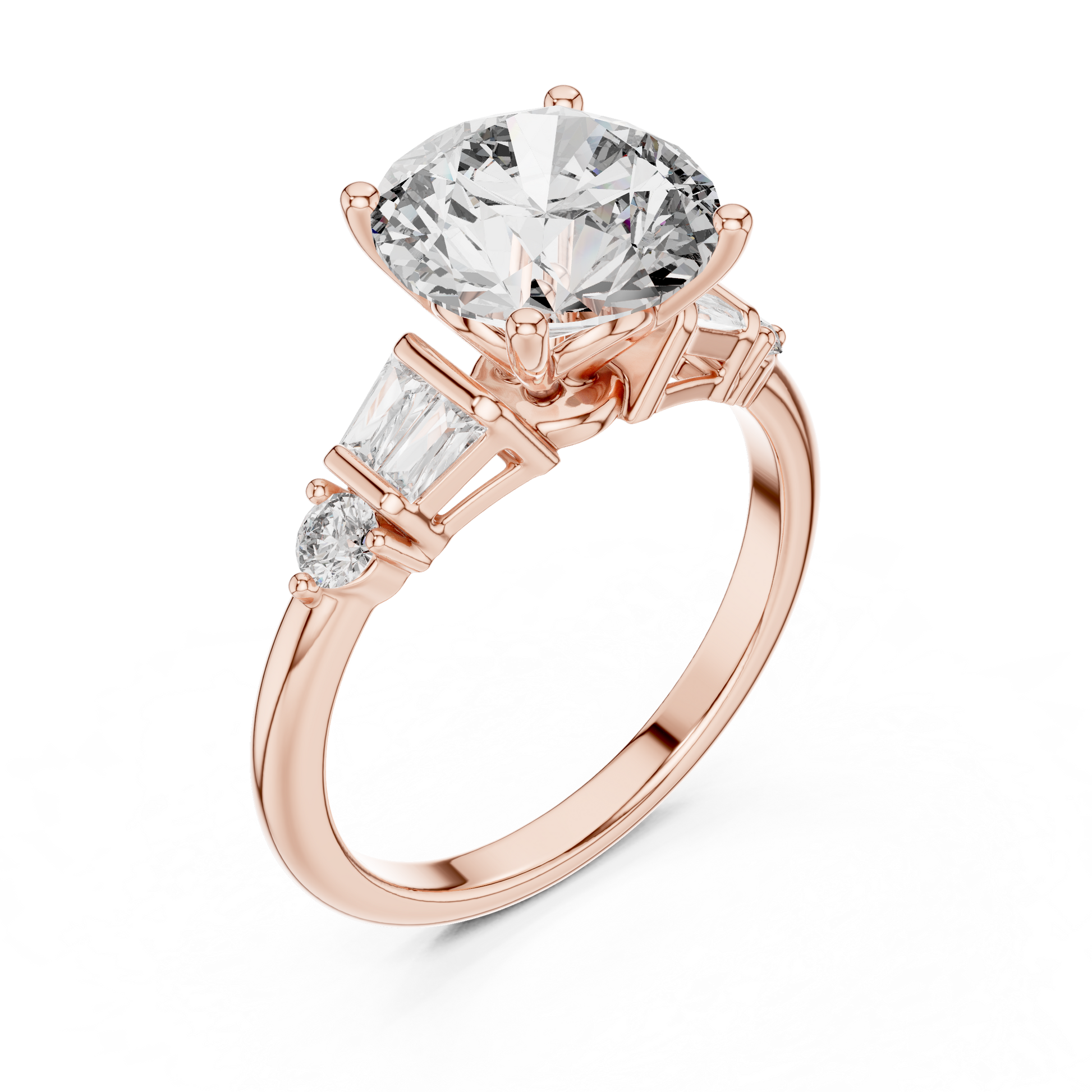 This design takes inspiration from the Golden Age of jewelry. The contrast between the brilliant Round Cut center stone and the geometric Tapered Baguette side stones creates a sophisticated, "Step-Down" effect. It guides the eye directly to the center, making the main stone pop.