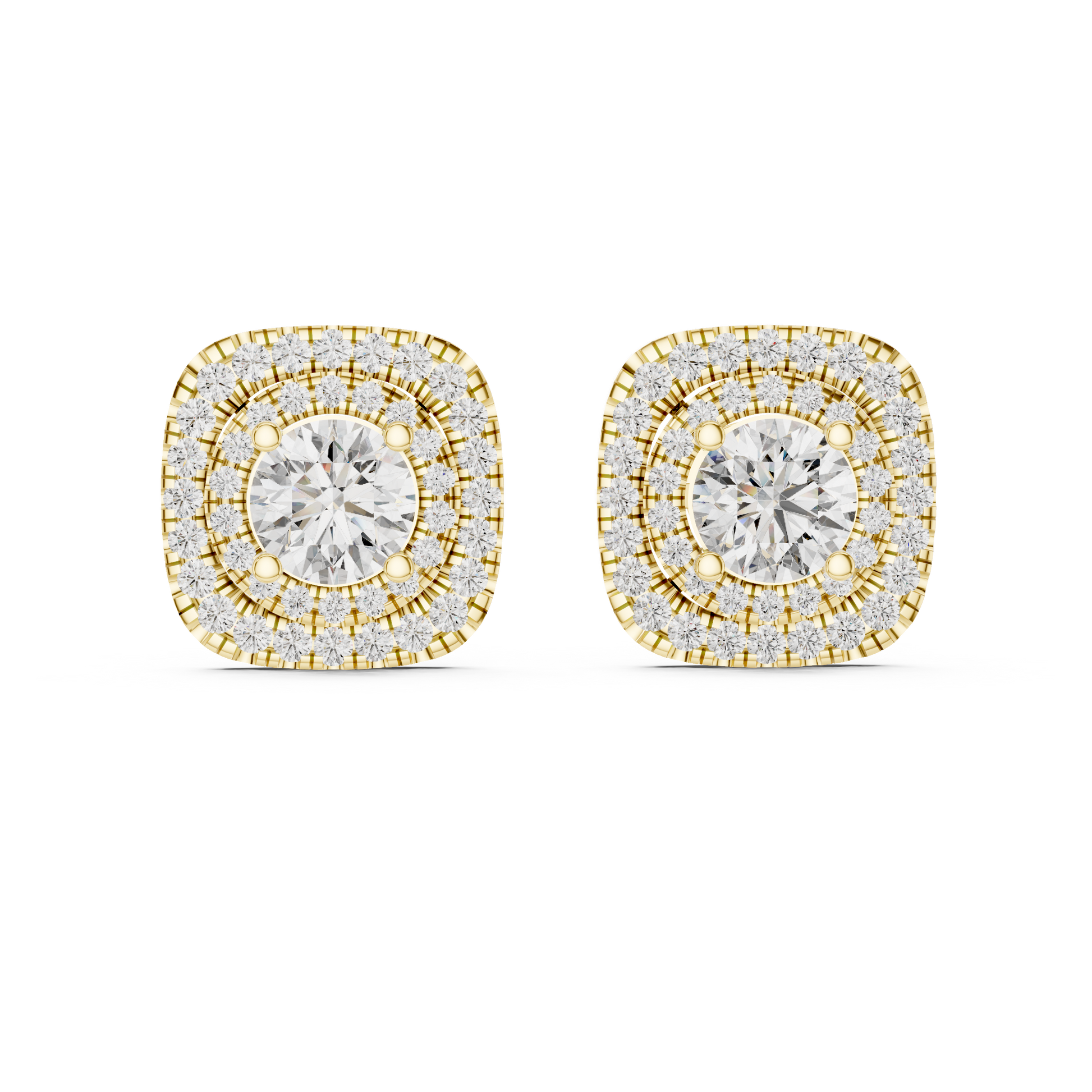 Crystal Crown Double Halo Diamond Stud Earrings - The “Infinity Crest” Cushion Halo Diamond Stud Earrings - Yellow Gold Regal Frame Double Halo Diamond Stud Earrings