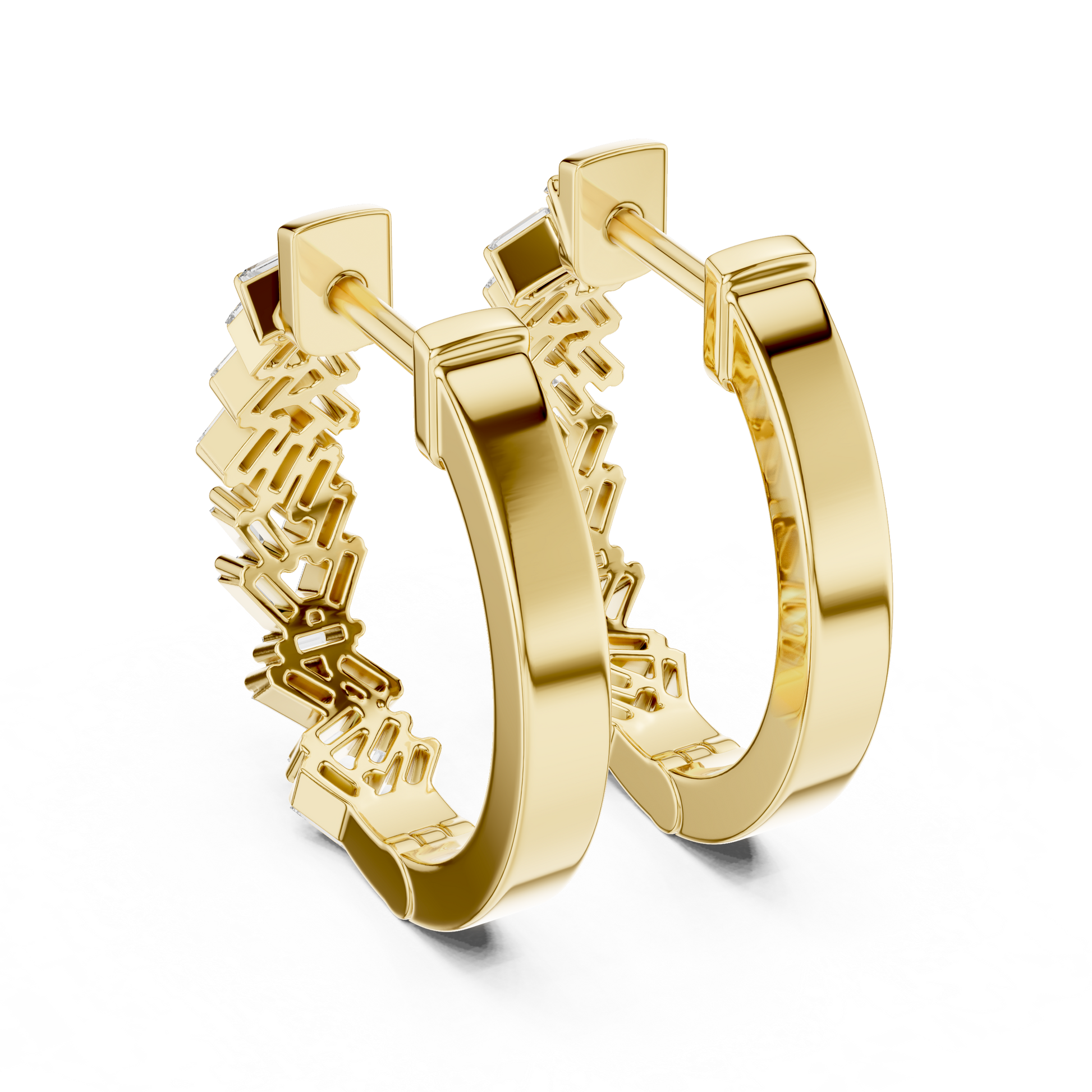 Designed for women who love bold elegance, these hoops shimmer with a geometric array of baguette-cut lab-grown diamonds — each one capturing light like a cascade of tiny mirrors.