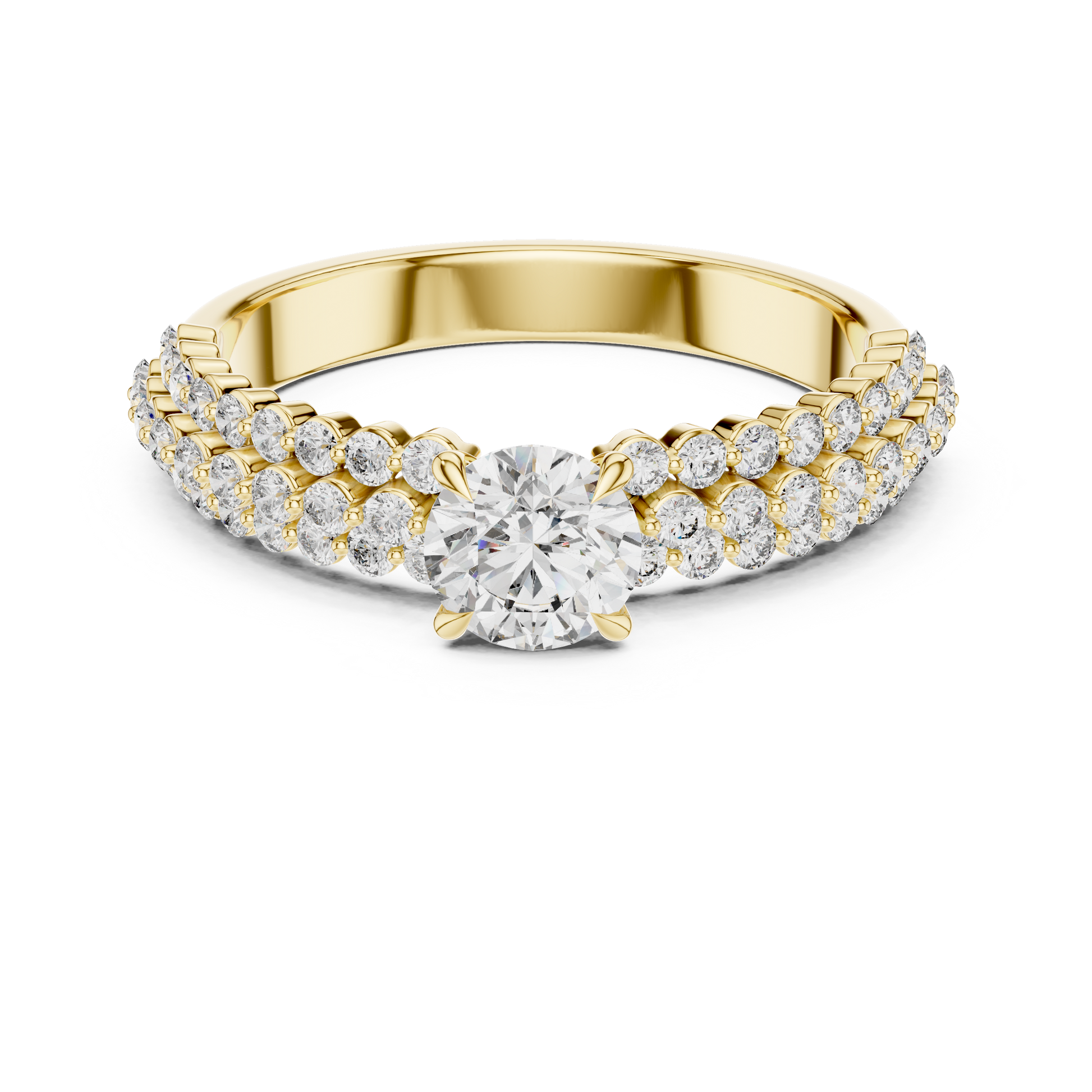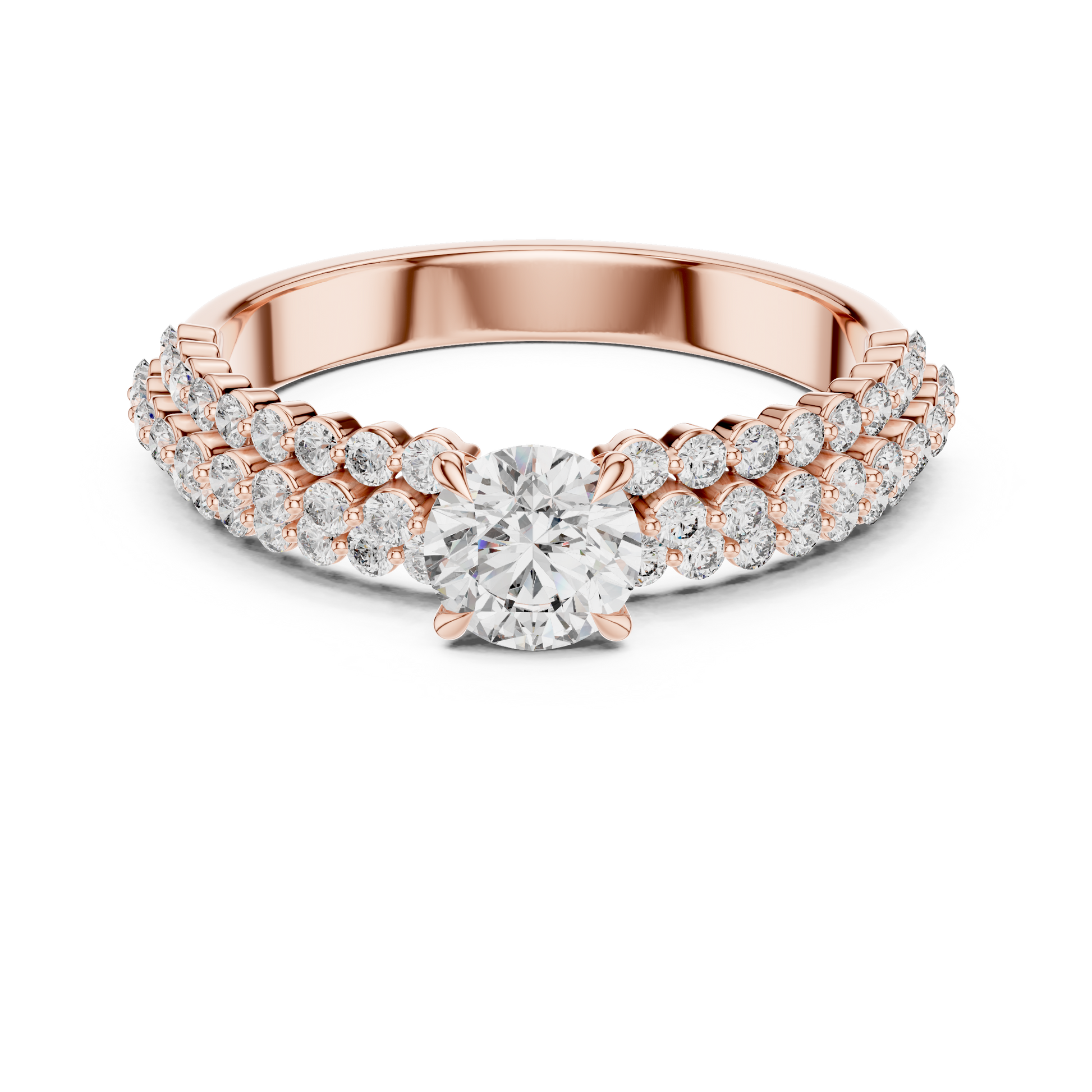 | Triple-row pavé diamond band with bold center solitaire |