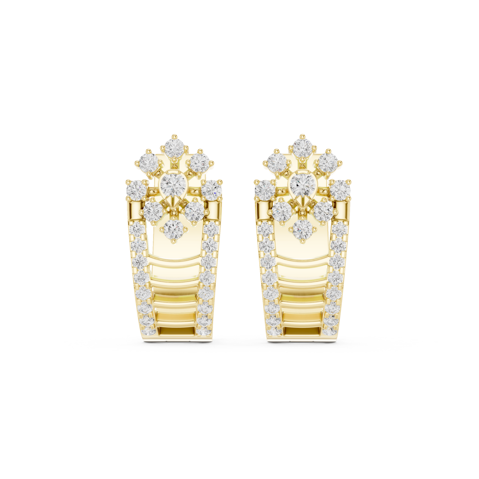 Elevate your ear game with the stunning Trilateral Diamond J-Hoops. Why settle for a single row of sparkle when you can have three? This architectural masterpiece features a "floating" center row of prominent stones, flanked by two precision-set pave rails. The unique "U-shape" or "J-Hoop" silhouette hugs the bottom of the earlobe, creating a look of suspended brilliance. Bold, structured, and undeniably luxurious, these earrings are designed for the woman who views her jewelry as her armor.