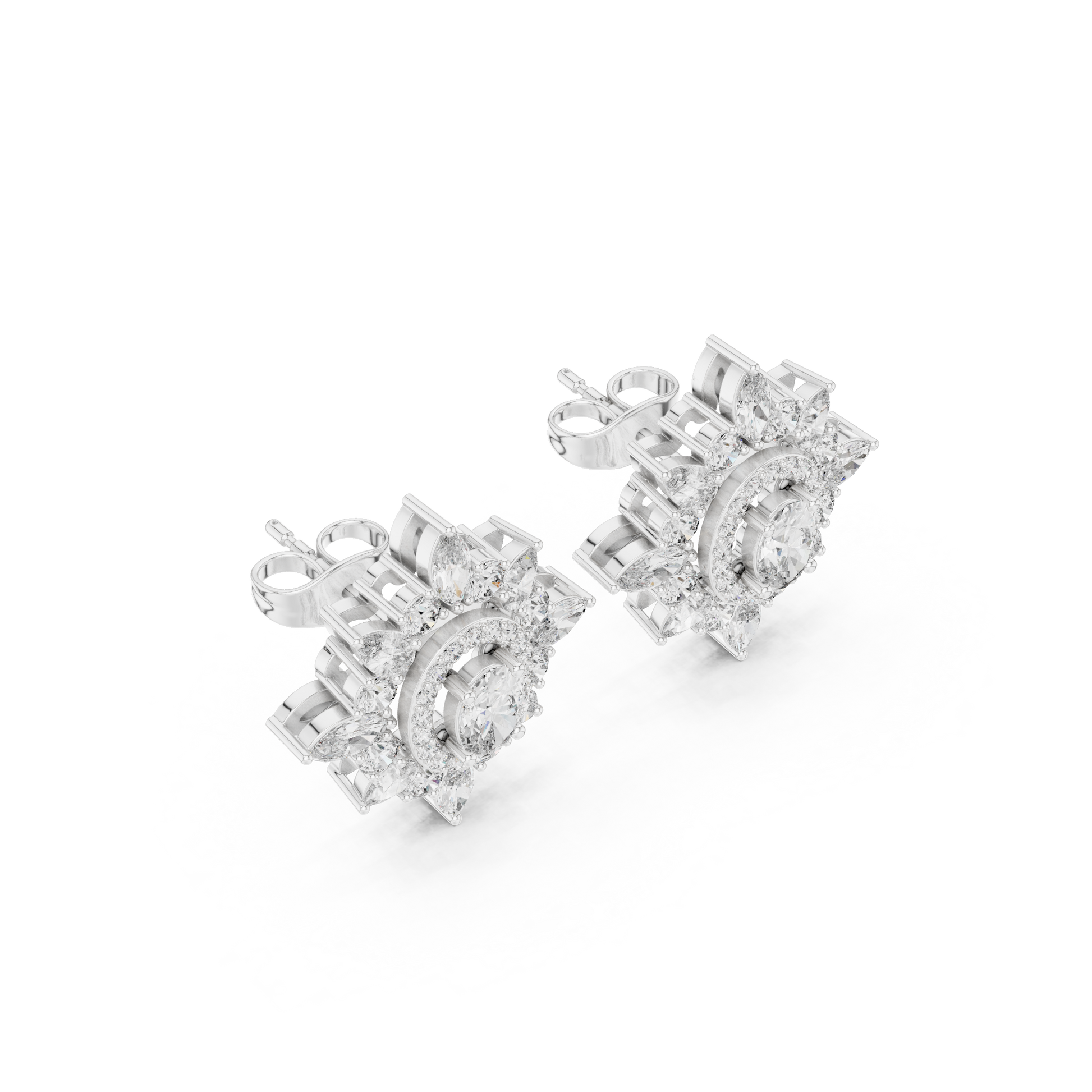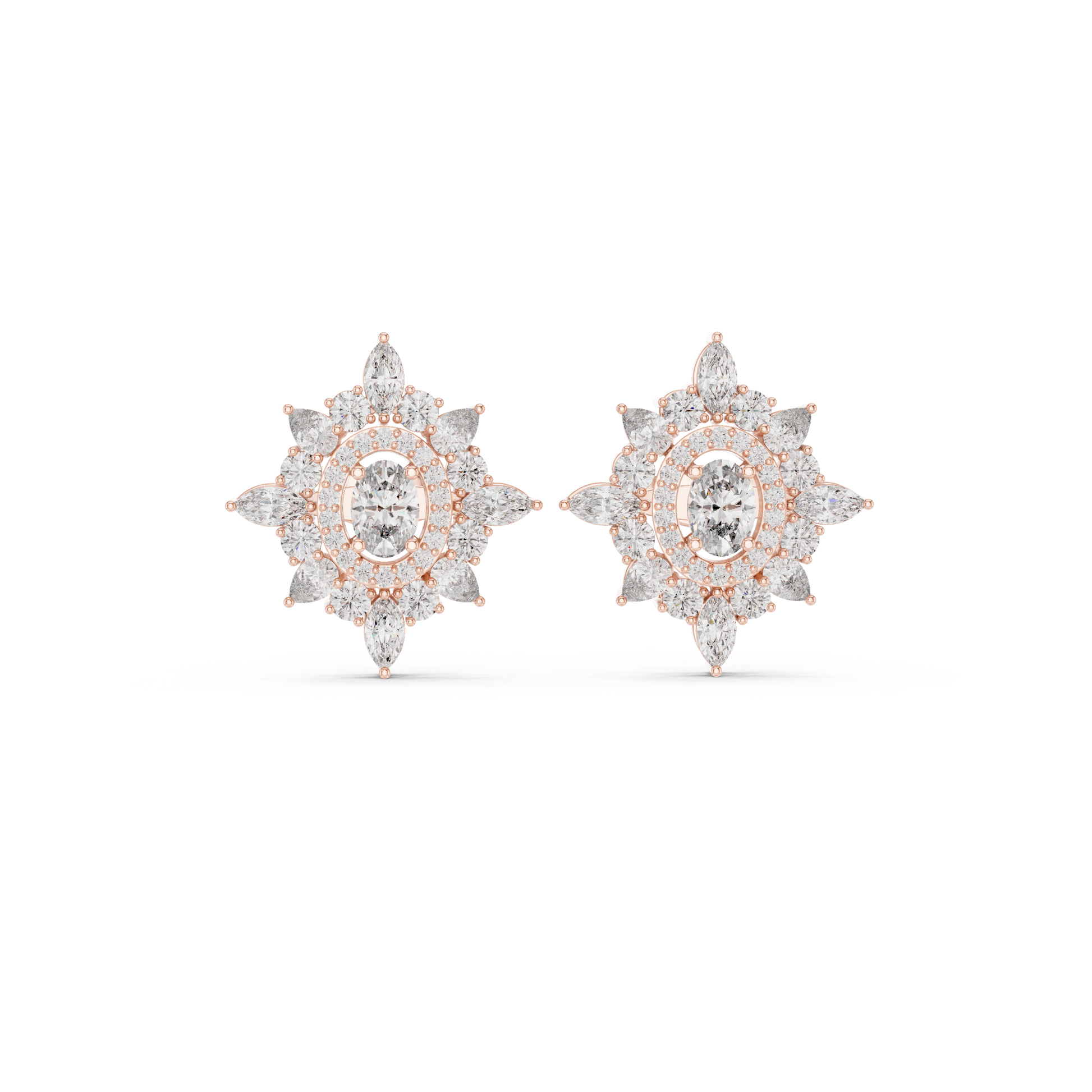 Each earring blooms in a radiant burst of marquise-cut diamonds, forming a star-kissed halo around a luminous oval center stone. The result is a piece that doesn’t just shine… it ignites.