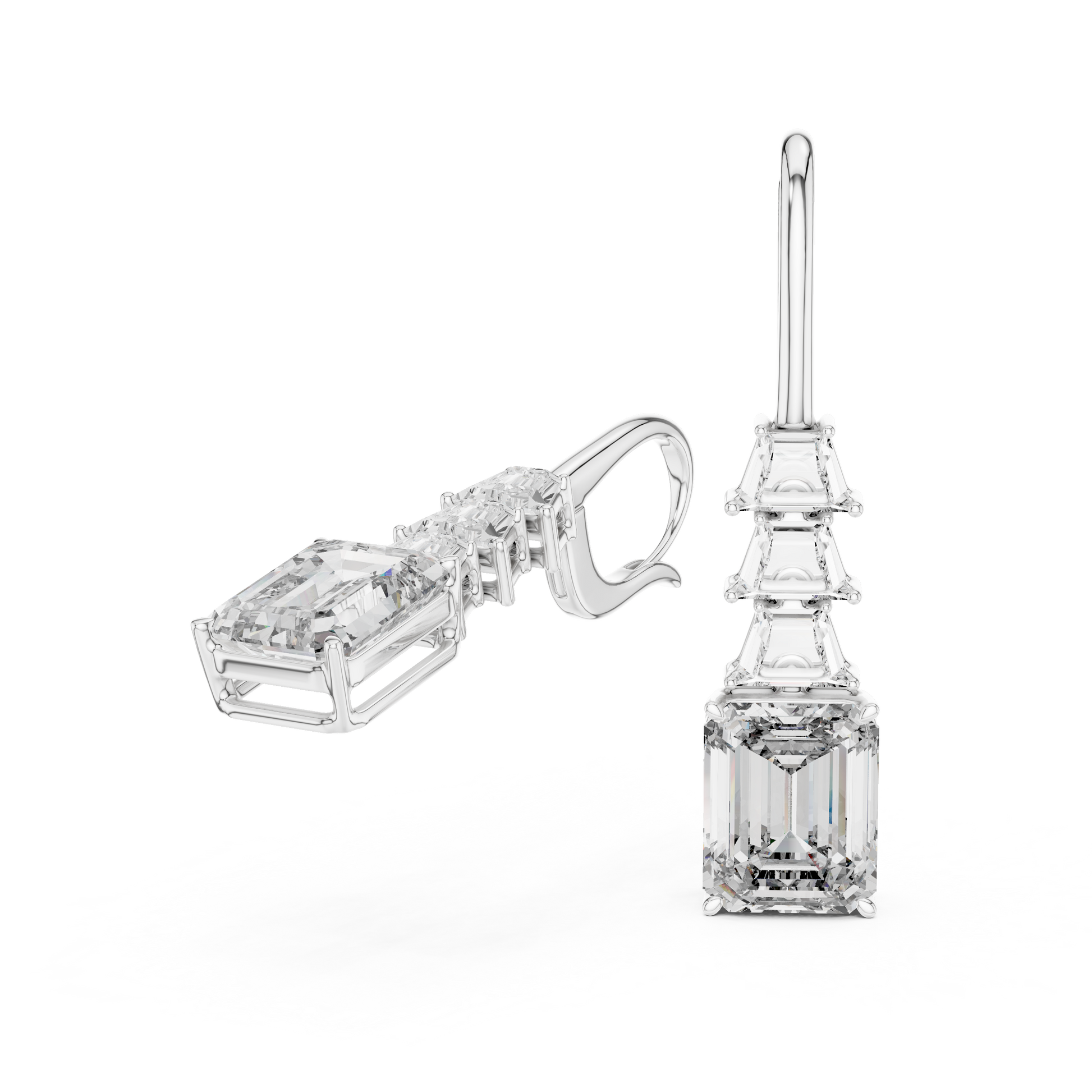 These long drop earrings are crafted to give you a modern, classy, and high-sparkle look. The design features one large emerald-cut stone at the bottom, and above it three perfectly aligned step-cut stones that create a beautiful tapered effect.