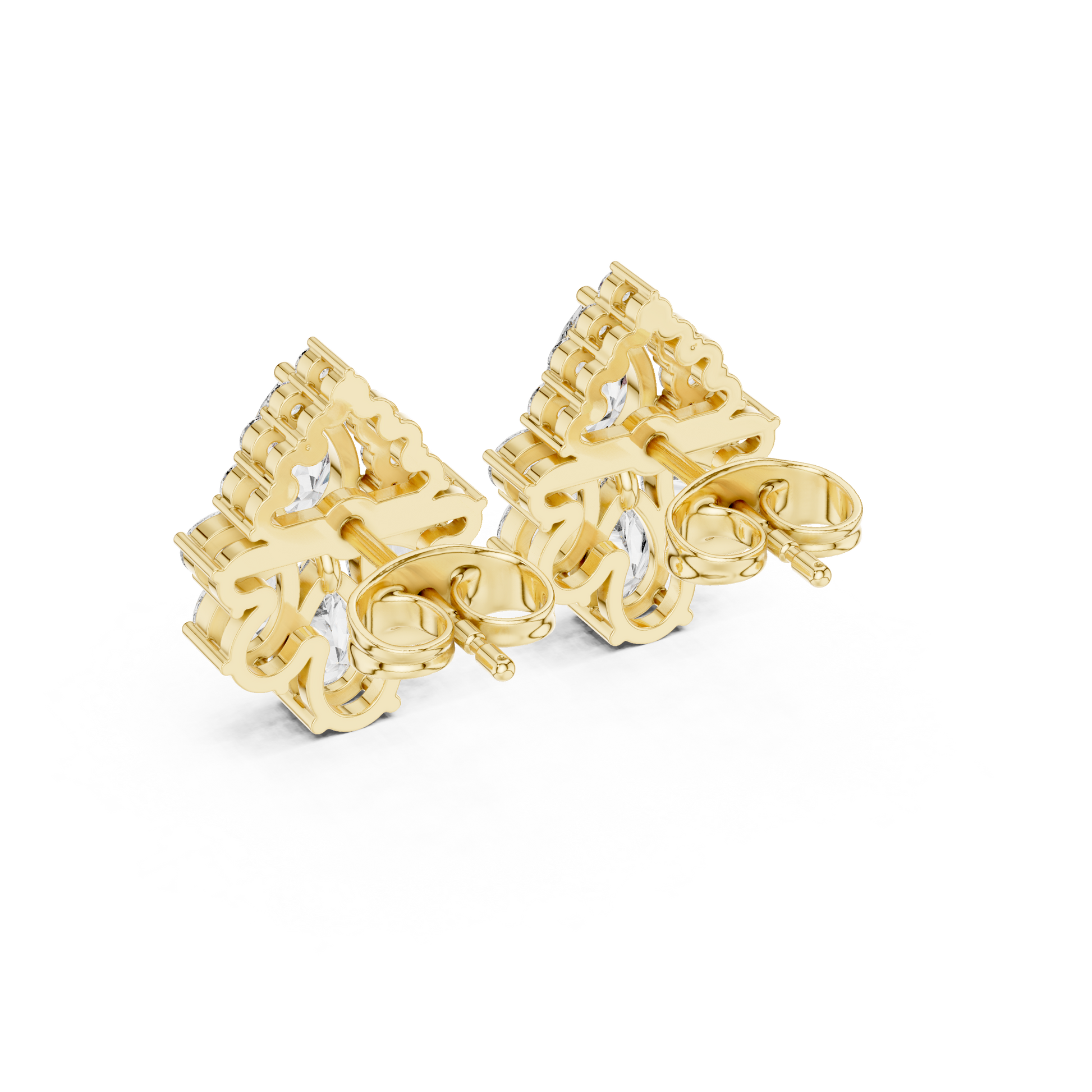 Step into the intersection of nature and modern architecture. These "Geometric Bloom" Studs redefine the classic flower earring by adding a bold, structural twist. Instead of a simple cluster, each marquise diamond is encased in a substantial 14K gold frame, creating a striking outline that emphasizes the shape of the petals. This "Open-Frame" design adds visual volume, making the earrings feel heavier and more luxurious, while the negative space allows light to dance through the structure. Perfect for the woman who loves floral motifs but craves a sharp, contemporary edge.