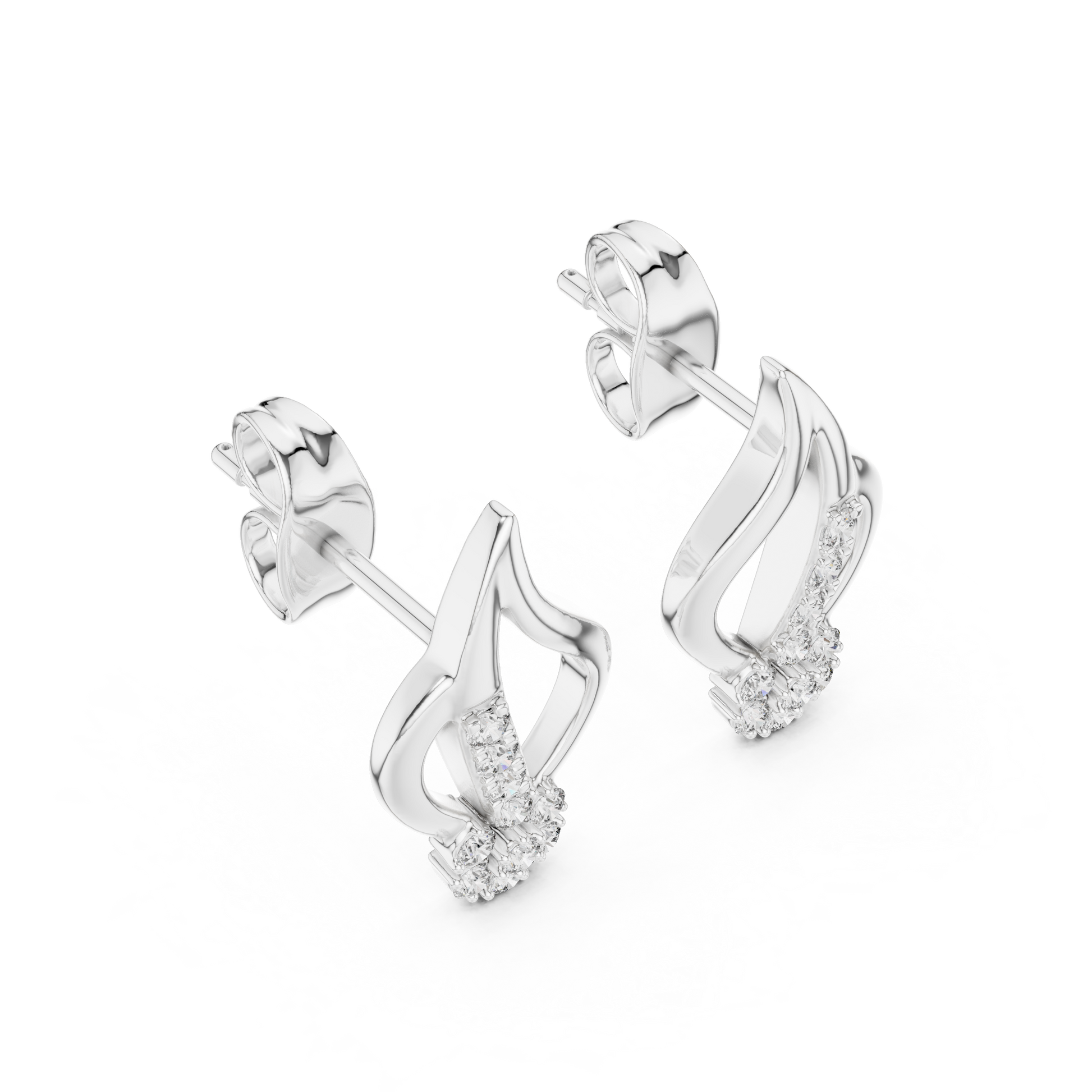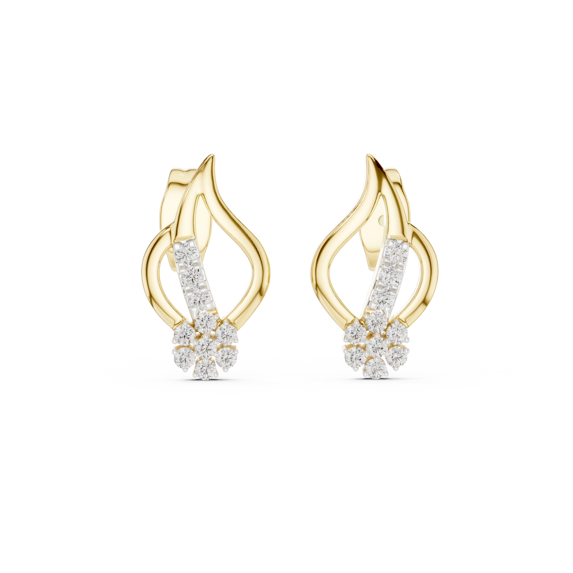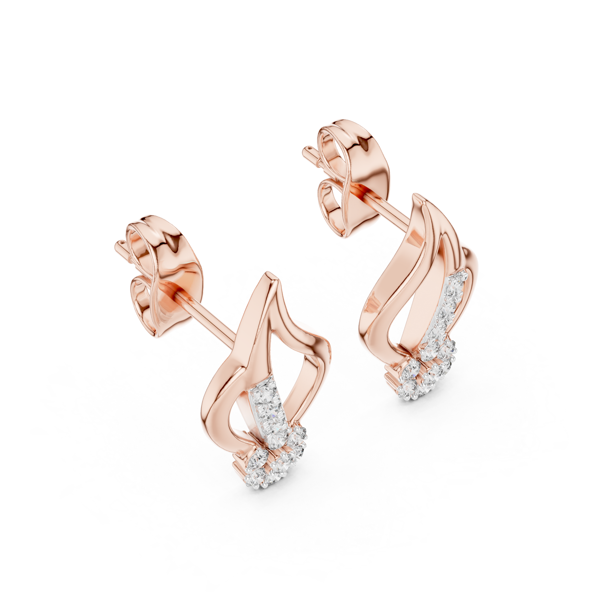 Ignite your style with these captivating Abstract Flame & Floral Stud Earrings. A masterful blend of fluid movement and classic elegance, these earrings feature a sweeping curve of rose gold that resembles a dancing flame or a stylized leaf, cradling a brilliant floral cluster at its base.