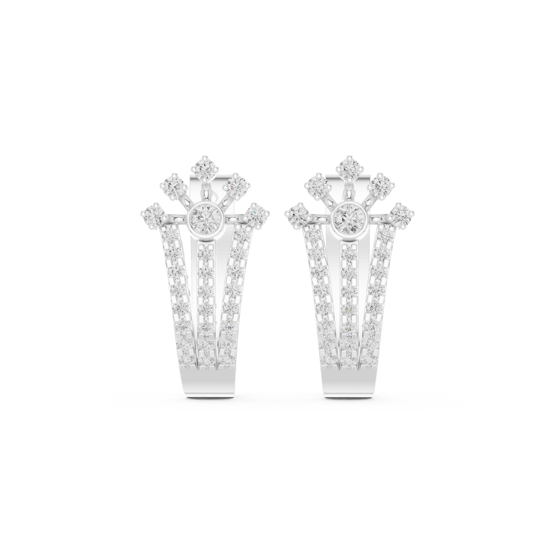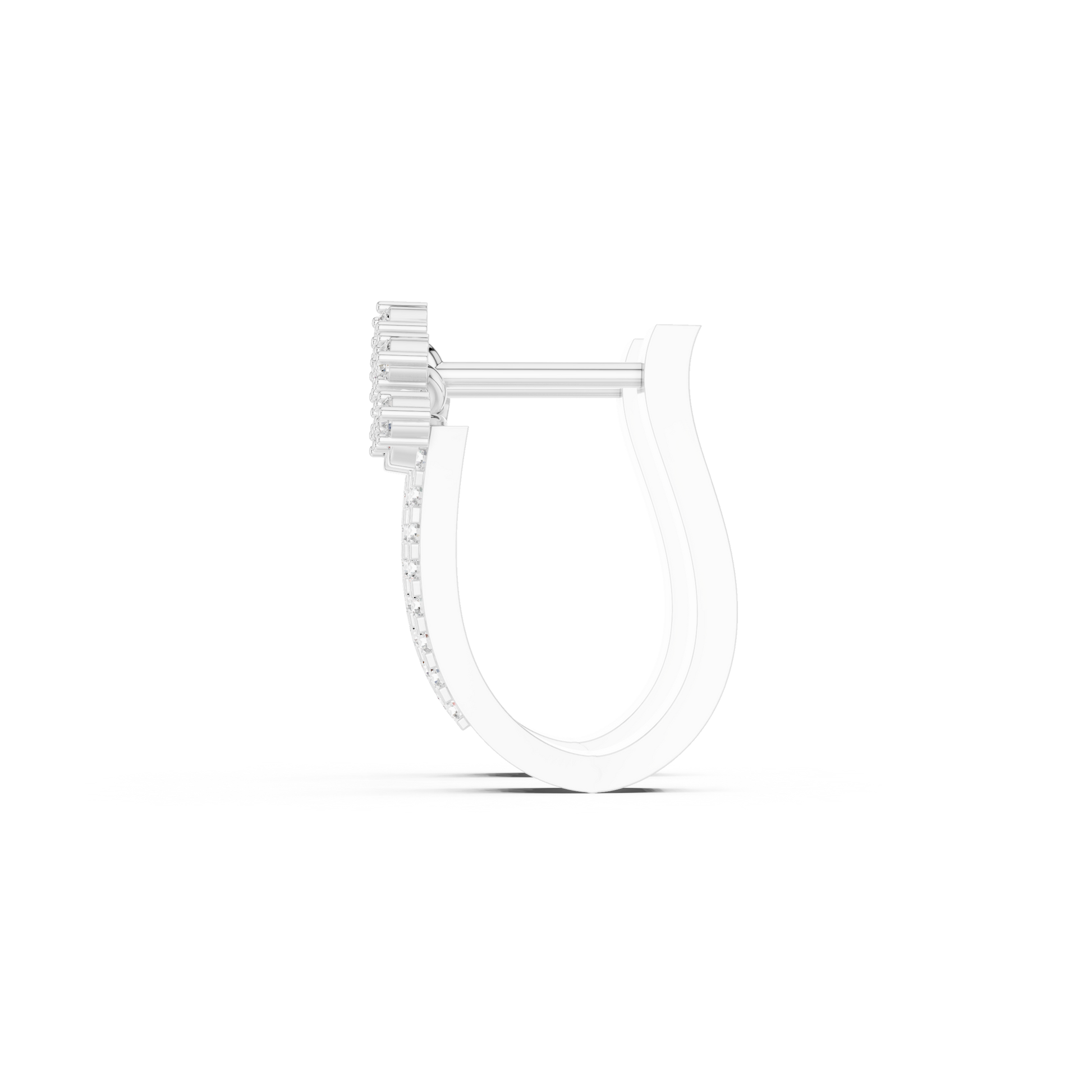 Elevate your ear game with the stunning Trilateral Diamond J-Hoops. Why settle for a single row of sparkle when you can have three? This architectural masterpiece features a "floating" center row of prominent stones, flanked by two precision-set pave rails. The unique "U-shape" or "J-Hoop" silhouette hugs the bottom of the earlobe, creating a look of suspended brilliance. Bold, structured, and undeniably luxurious, these earrings are designed for the woman who views her jewelry as her armor.