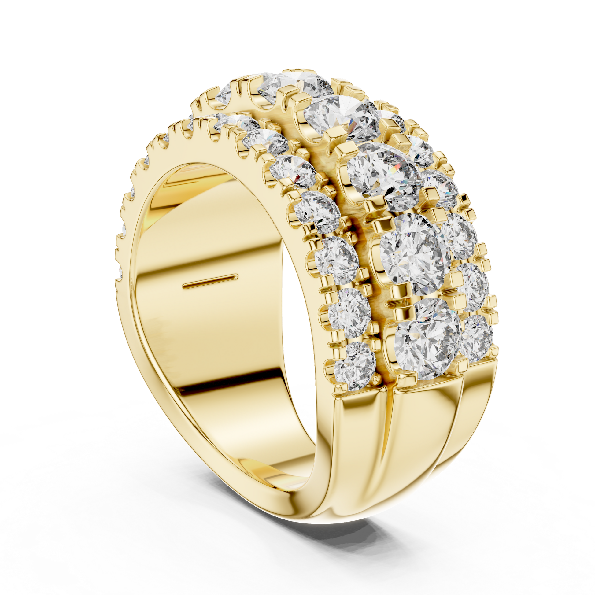 Why whisper when you can shout? This Triple Row Pave Eternity Band is the ultimate declaration of luxury. Featuring three distinct rows of precision-set brilliant stones, this ring creates a literal wall of light on your finger. It is wide, bold, and designed for the woman who isn't afraid to shine.
