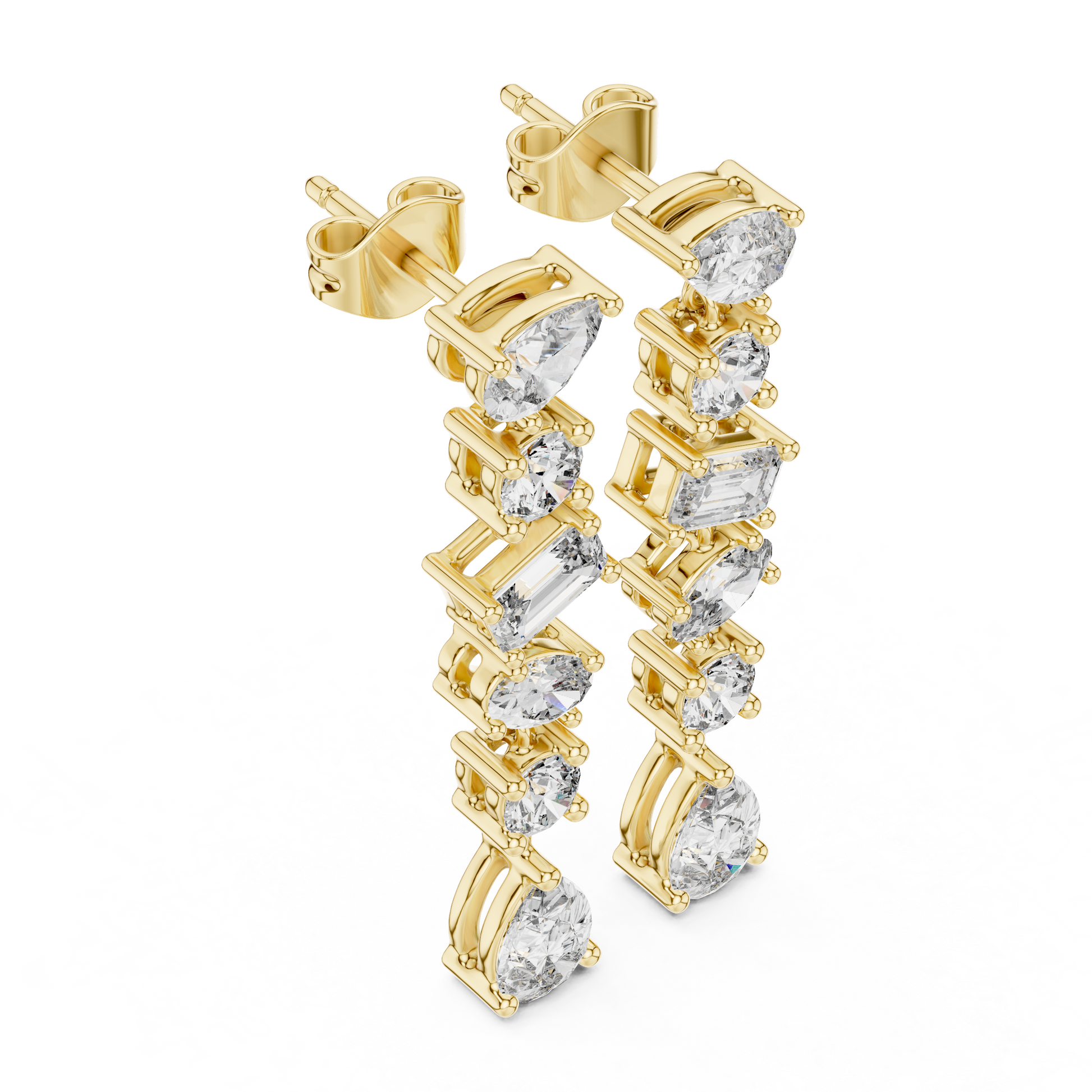 A "Mixed-Cut" Waterfall design that celebrates the unique beauty of every diamond shape. A perfect fusion of Art Deco structure (the Emerald cut) and romantic softness (Pear & Oval cuts). Linear and vertical, designed specifically to elongate the neck and slim the face. Why choose one diamond shape when you can have them all? This design creates a complex, mesmerizing sparkle because each cut reflects light differently, creating a texture of brilliance that standard earrings can't match.