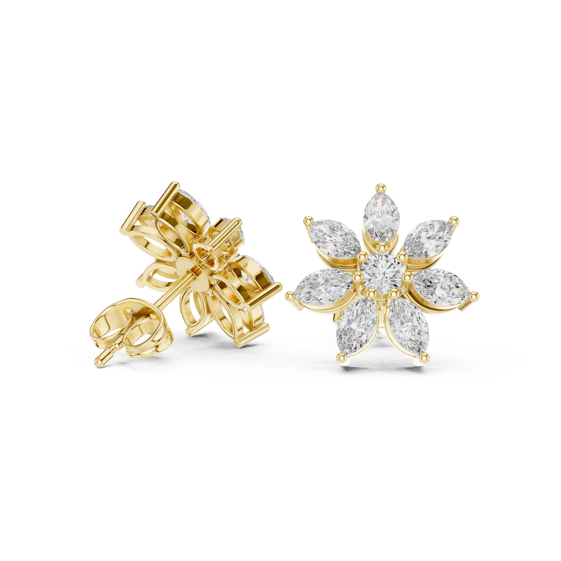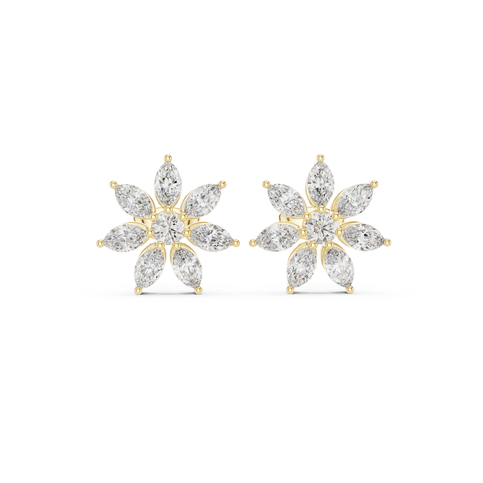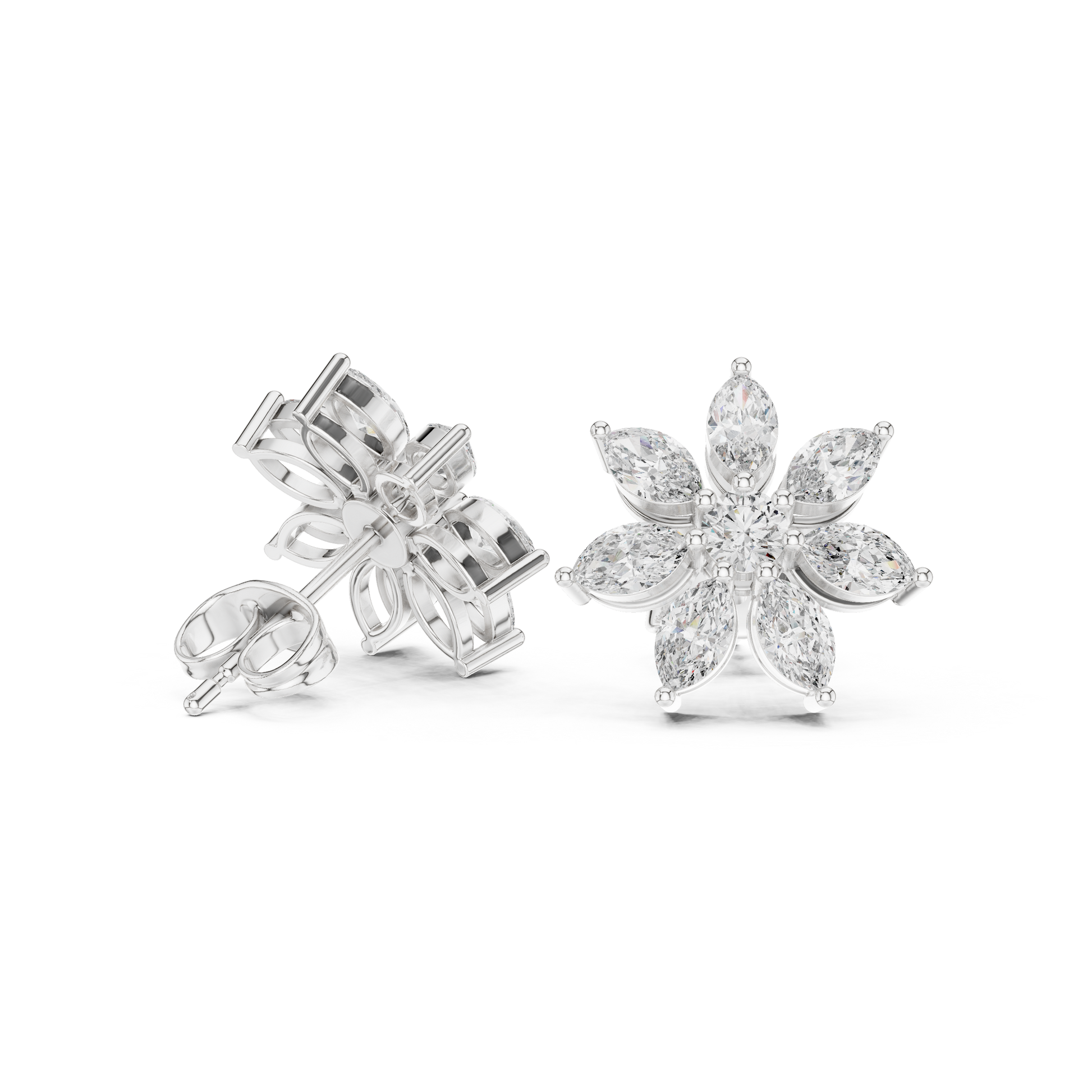 Capture the eternal beauty of a blooming flower or a winter snowflake with these mesmerizing Marquise Starburst Studs. This design is a celebration of symmetry, featuring a brilliant round center stone surrounded by eight perfectly matched marquise "petals." Unlike standard studs, the outward-pointing stones create an explosion of light, drawing the eye to the center of your face. Whether you see them as a floral tribute to spring or a sparkling snowflake for a winter wedding, these earrings offer a "high-impact" look that radiates luxury from every angle.