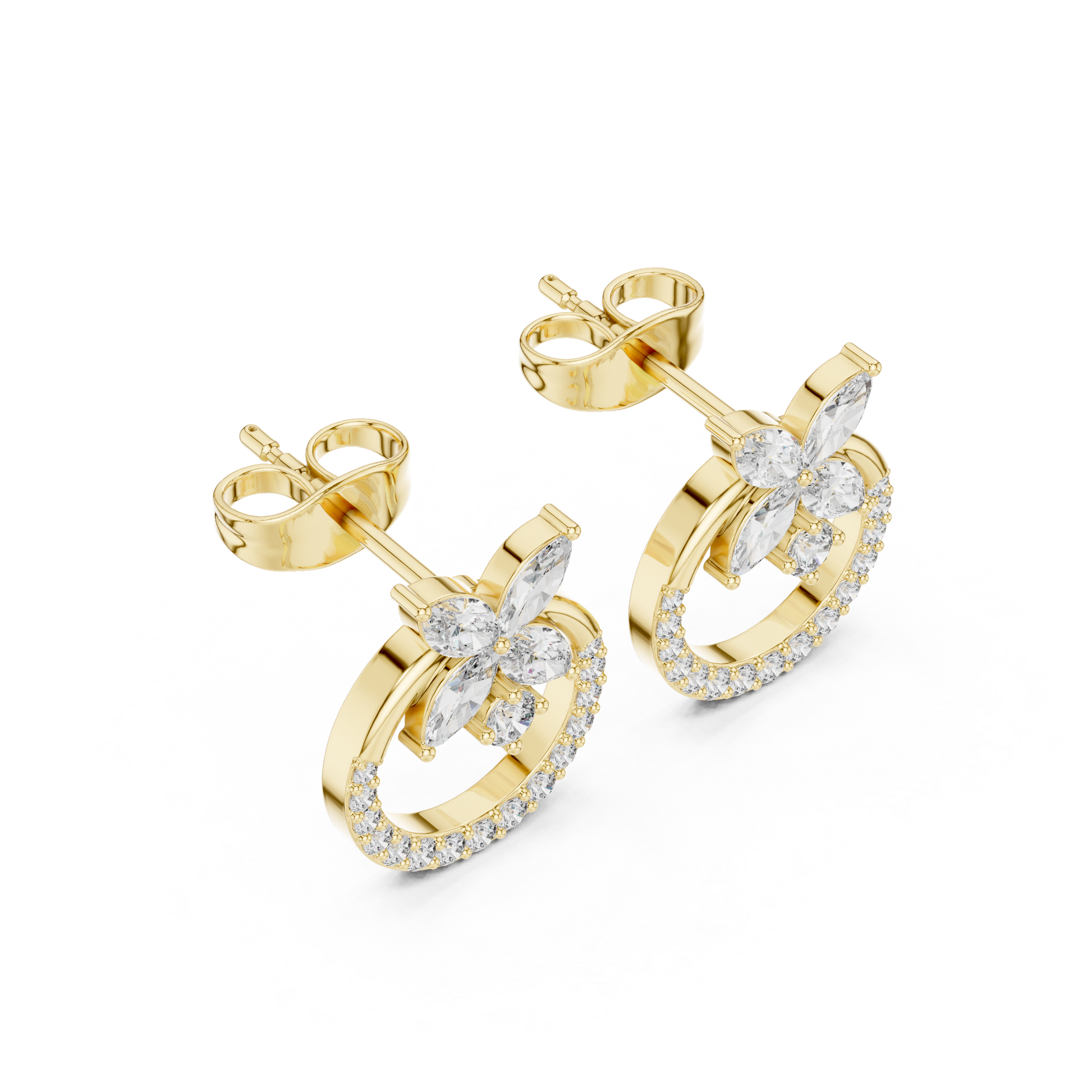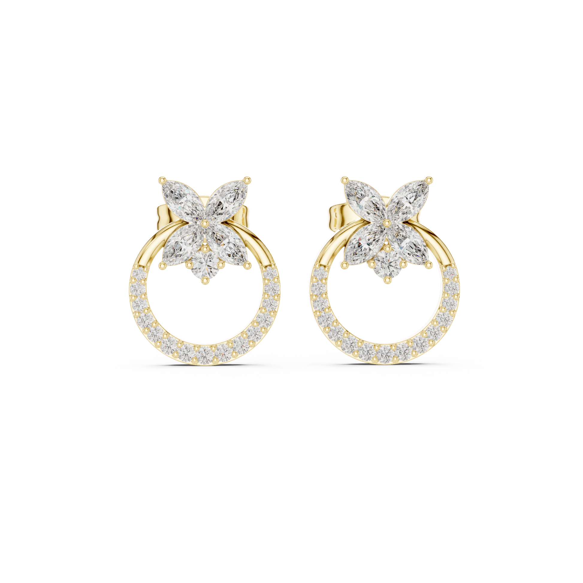 Reimagine the classic floral stud with a touch of modern geometry. These Flower Open-Circle Earrings beautifully balance the softness of nature with the clean lines of contemporary design. A delicate diamond-encrusted circle acts as a glowing frame, upon which rests a brilliant marquise flower. The interplay of the solid circular form and the organic petals creates a captivating silhouette that feels both grounded and ethereal. Perfect for the woman who appreciates jewelry that is as intricate as it is wearable.