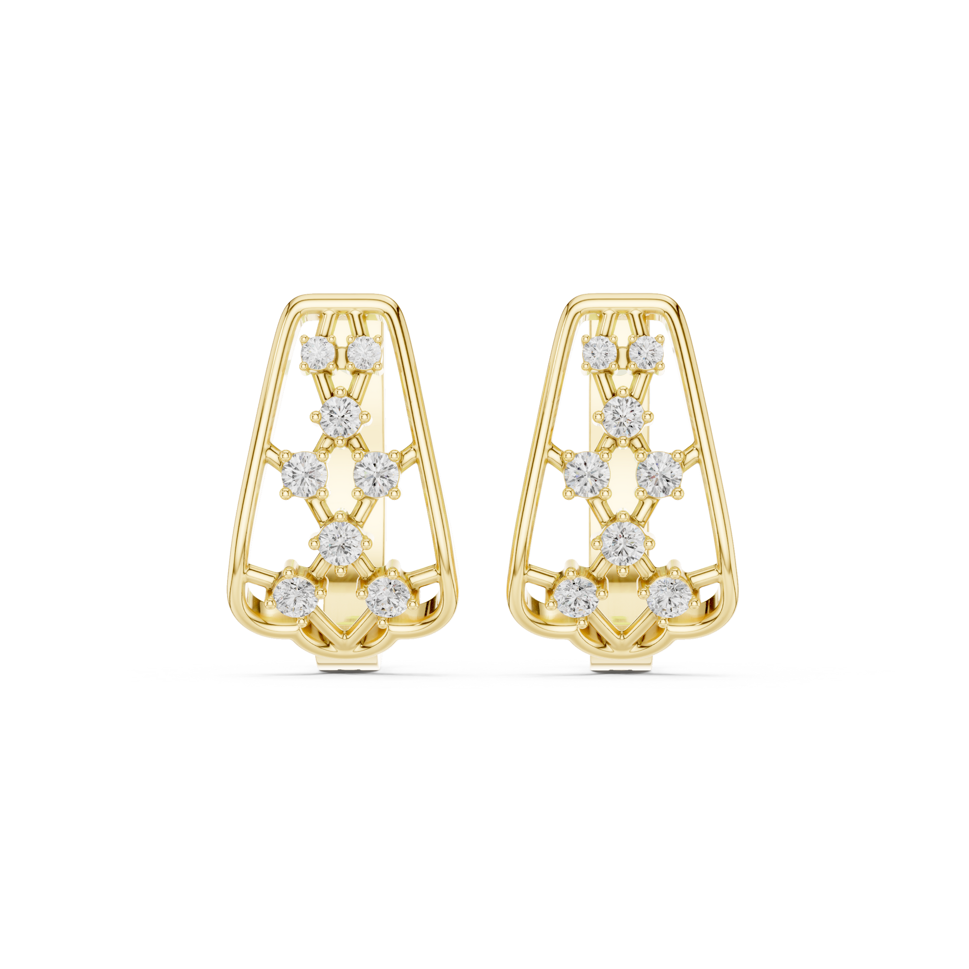 Step into the future of fine jewelry with these Geometric Lattice Huggie Hoops. Drawing inspiration from modern architecture and structural art, this design features a bold open-work cage. Instead of traditional rows of stone, diamonds are strategically placed at the intersections of the gold cross-bars, resembling a constellation of stars connected by golden lines. Wide, confident, and meticulously crafted, these earrings are for the woman who prefers structure, symmetry, and sophisticated sparkle.