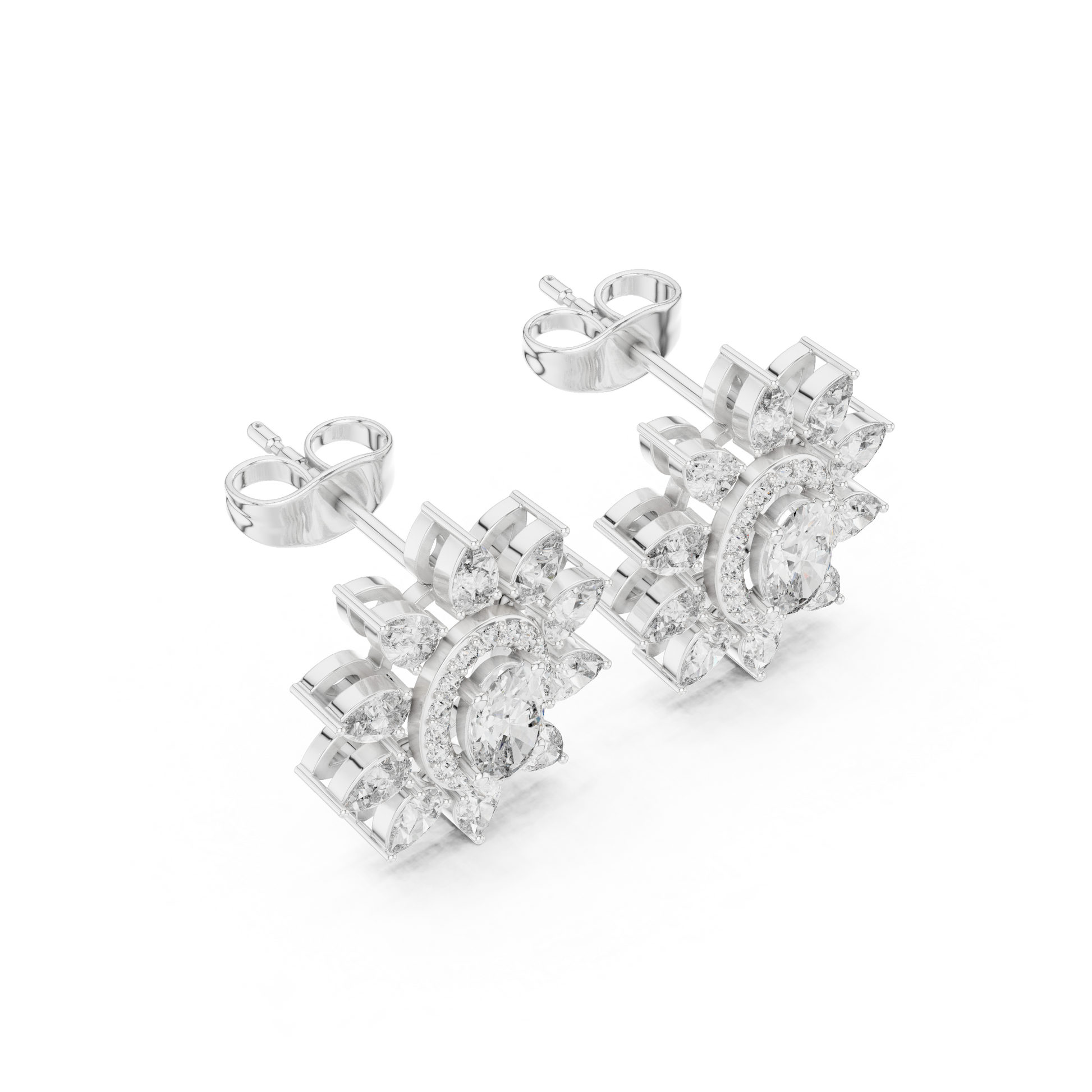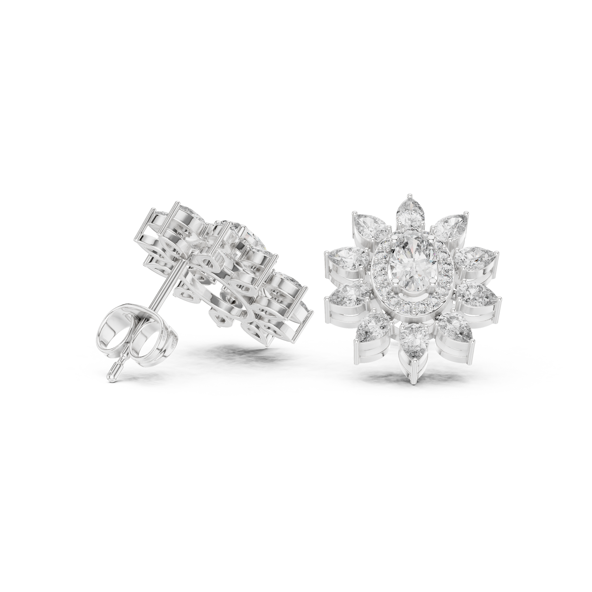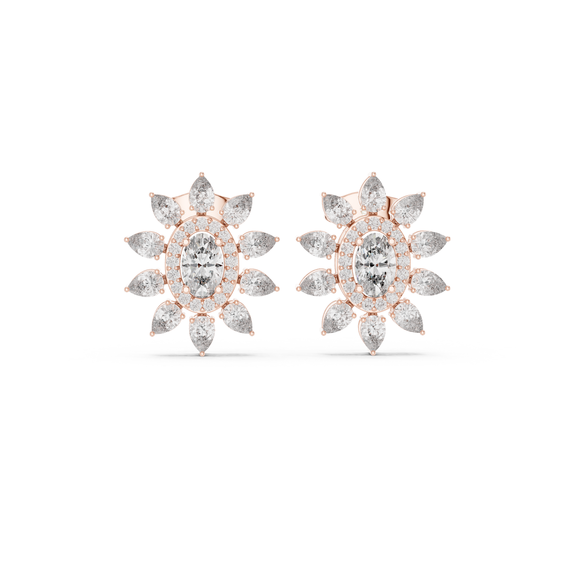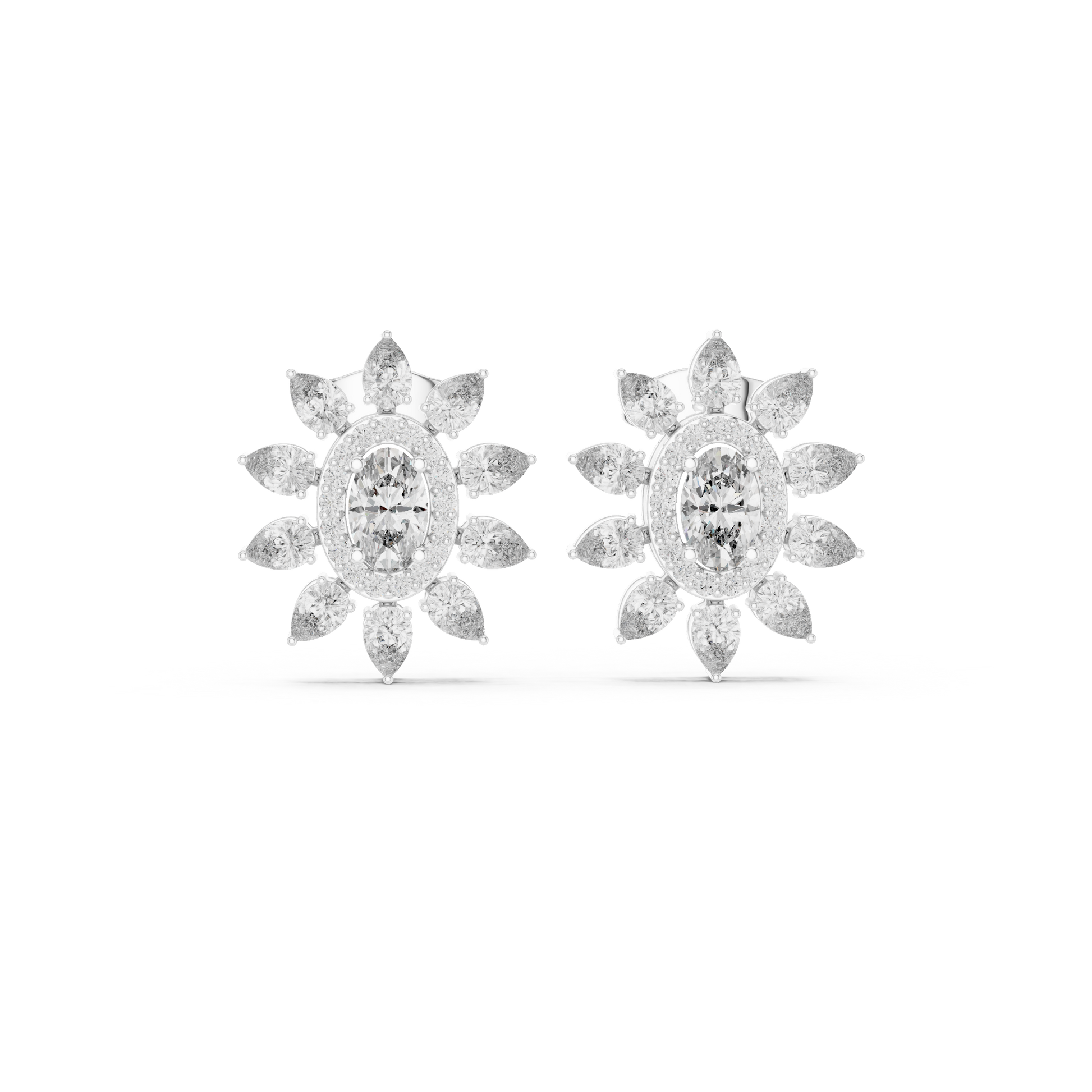 Capture the warmth and radiance of the "Golden Hour" with these Oval Sunflower Studs. This design is a masterpiece of light and geometry. At its heart lies a brilliant oval-cut stone, encircled first by a delicate micro-pave halo, and then crowned by a dramatic "starburst" of pear-cut diamonds. This double-layer effect creates a silhouette that mimics a blooming sunflower or a radiant star. Crafted with an intricate filigree basket that is just as beautiful from the back as it is from the front, these earrings are for the woman who demands luxury in every detail.