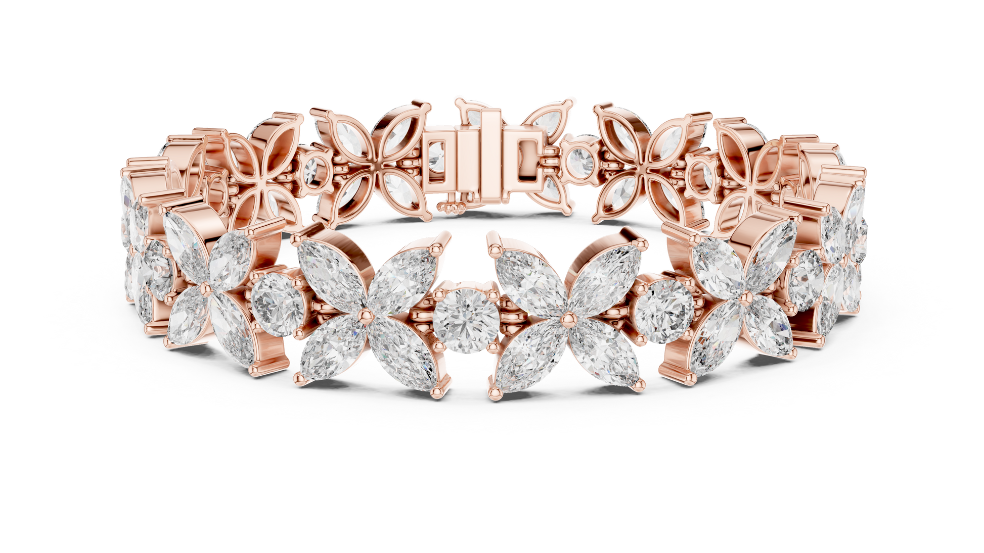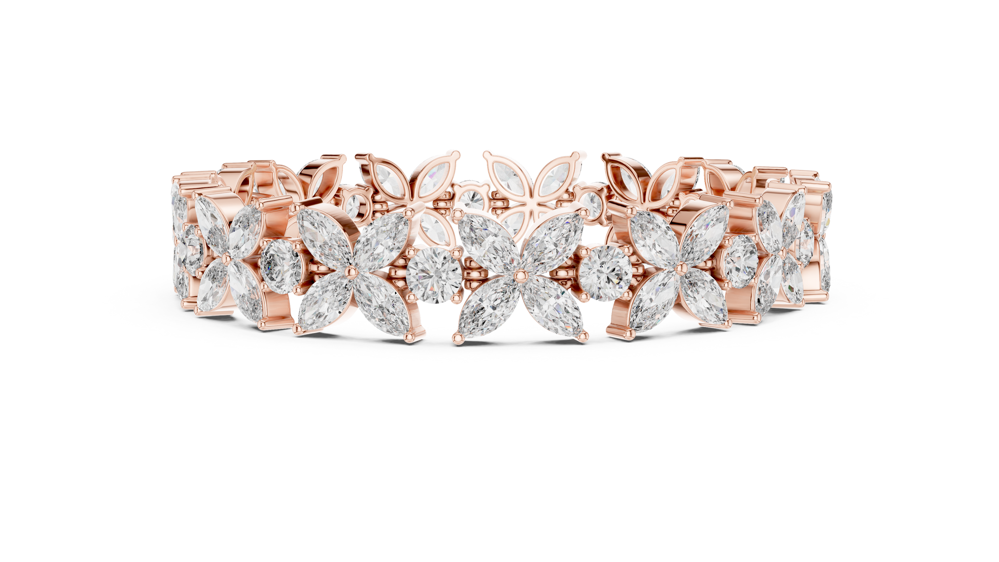 Introducing our Marquise Petal Diamond Floral Bracelet — a breathtaking blend of nature’s poetry and fine-jewelry craftsmanship. Each marquise-cut stone is arranged in a delicate four-petal blossom, creating a continuous garden of sparkle around your wrist.