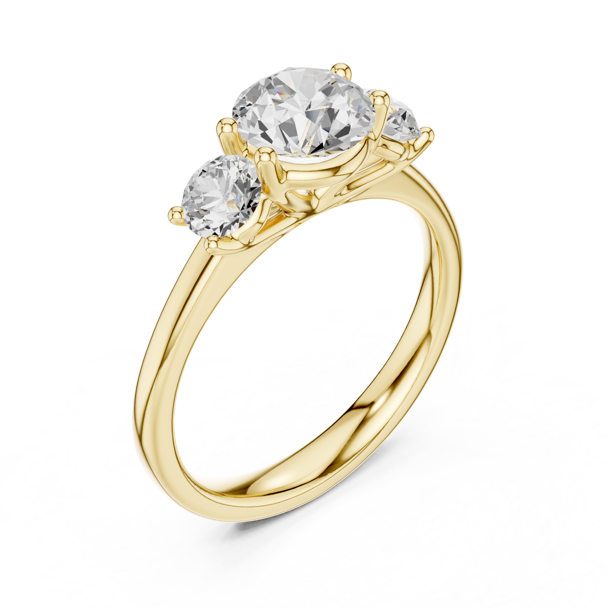 This elegant three-stone round brilliant ring features a dazzling 6.30 mm center diamond weighing approximately 0.90 carats, beautifully held in a secure collet setting. Flanking the center gem are two perfectly matched 4.00 mm side diamonds totaling 0.60 carats, enhancing the brilliance and balance of the design.